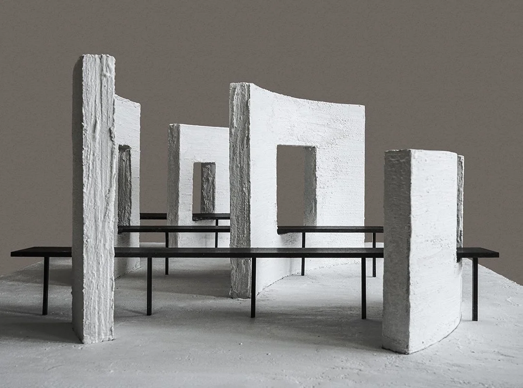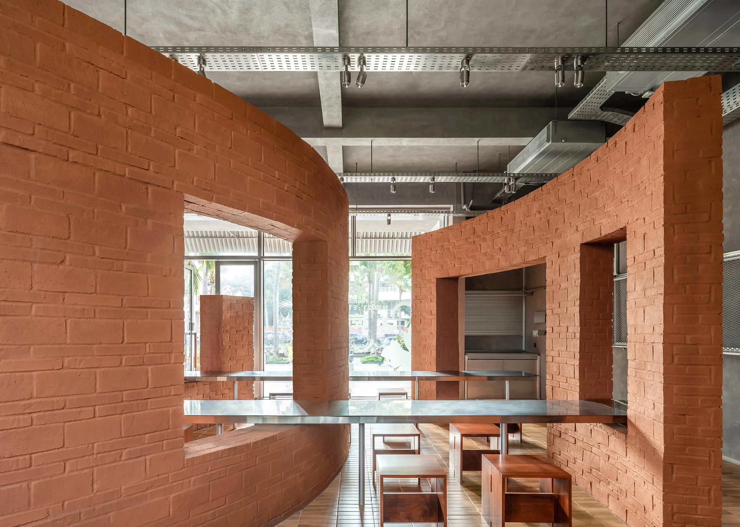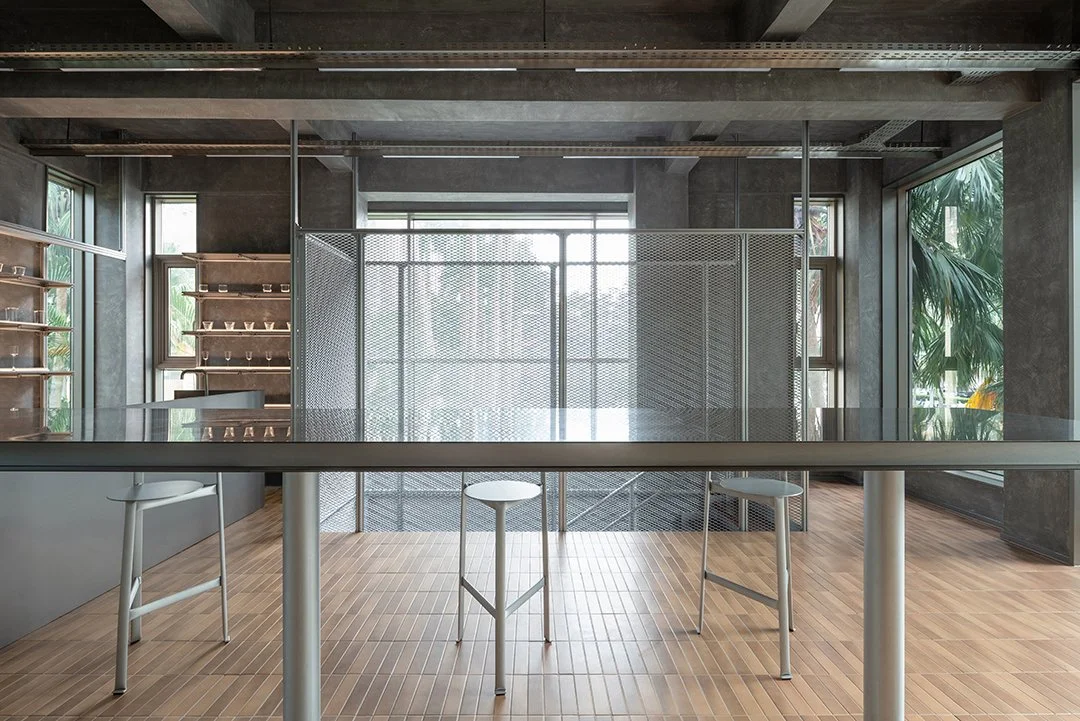 Three curved walls, varying in height, intervene in the space like abstract forms, carving out distinct zones within the open layout—giving shape to movement and a sense of pause. The walls reference the weathered volcanic red soil of the Fushan coffee-growing region. The earthy texture and traces of handwork speak of the land, fostering an emotional connection between people, the space, and the coffee. Meanwhile, three continuous steel tables traverse the space, passing through the walls to create openings and sightlines. The act of coffee drinking and social interaction is framed as part of the exhibition, transforming these everyday actions into an integral part of the spatial narrative. The counter positioned along this trajectory, serves traditional Fushan coffee brewed in tin pots. The juxtaposition of earthen masonry and stainless steel introduces a deliberate material dissonance, situating the project between craft and production, past and present.