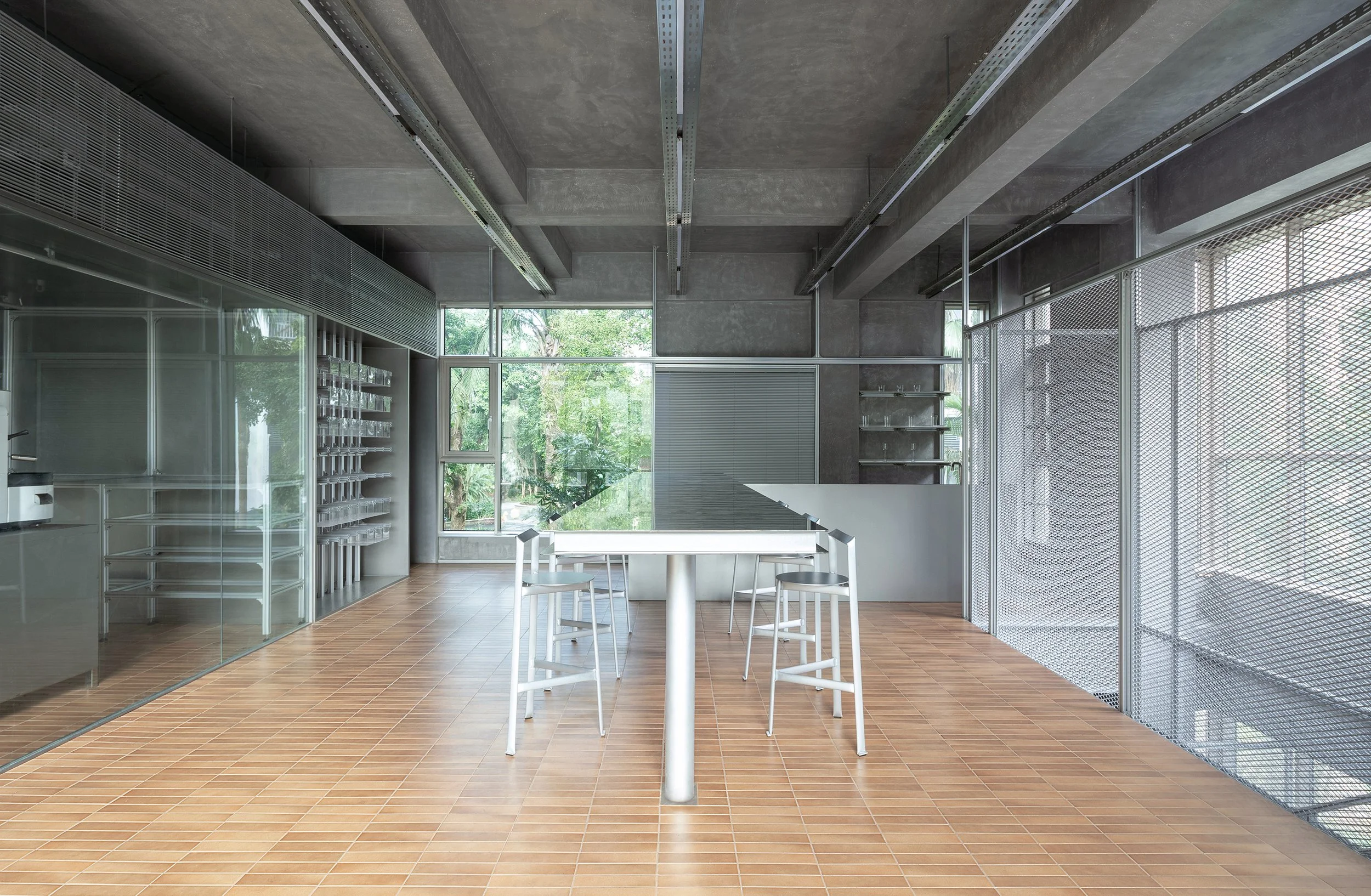 The spatial language continues that of the lower level, while adopting a more controlled and transparent material expression to foreground function. The roasting machine occupies a key position within the space, serving as both a functional and experiential focal point. The layout is organized around a central worktable supporting staff cupping, barista training, and customer engagement, integrating roasting, retail display, and auxiliary service into a continuous operational field.