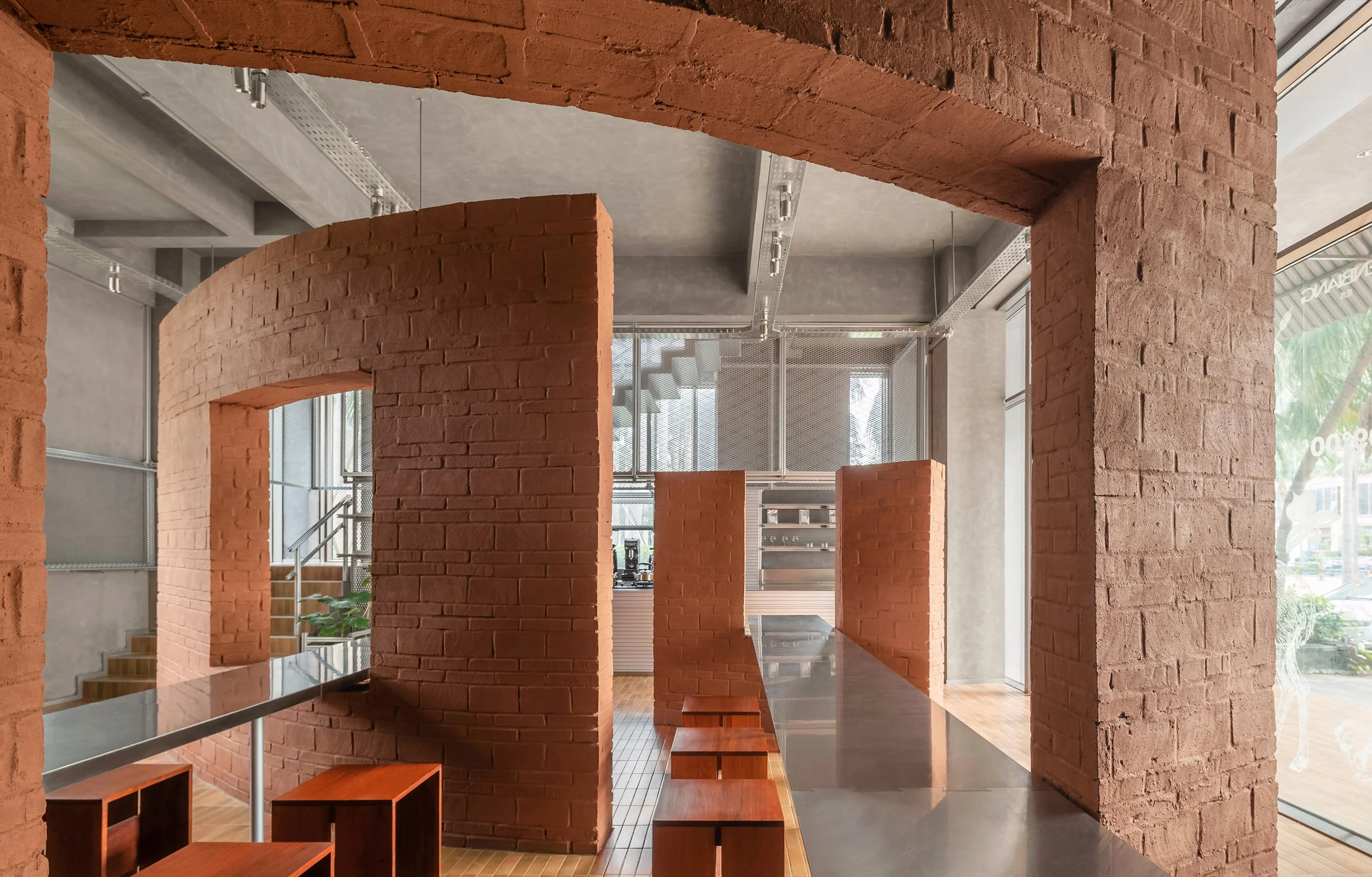 三道弧形墙体高低错落,以近似雕塑的姿态介入空间,在流动平面中划分出不同尺度的领域,建立秩序,暗示停留。墙面材料取意于福山咖啡产区的风化火山岩壤土,其砖红色质感与手工痕迹回应着土地记忆,也拉近了空间、饮品与人的情感距离。轻薄延展的钢制长桌穿墙而设,其路径在墙体之间切割出洞口与视线通道。人们饮用咖啡与交谈的场景被“框定”为展览的一部分,使行为本身成为空间叙事。视线沿长桌引向位于空间一侧的吧台,在此提供以锡壶冲泡的传统福山咖啡。取自于土地的红土砖墙与工业化的不锈钢桌面的并置,在质感、工艺与时代属性上构成鲜明的对照,为空间注入张力。