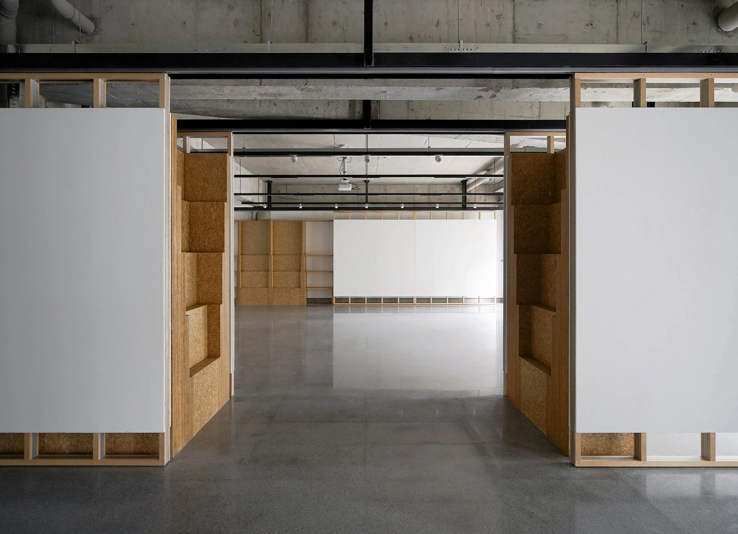 A multi-layer system of movable walls enables fluid functional configurations. When the central walls are closed, the space divides into two independent areas capable of hosting simultaneous activities. When fully opened, it unfolds into a continuous field suitable for larger events. Other walls reposition to create varied circulation routes and exhibition surfaces, allowing the space to accommodate exhibitions, lectures, screenings, workshops, and children's activities.